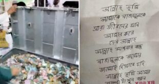 কিশোরগঞ্জের ঐতিহাসিক পাগলা মসজিদে প্রতিবার দানসিন্দুক (দানবাক্সে) খুলে বিপুল পরিমাণ টাকা, বিদেশি মুদ্রা ও স্বর্ণালংকার মিললেও এবারও পাওয়া গেছে একটি ভালোবাসার আকুতি ভরা চিরকুট। শনিবার (৩০ আগস্ট) সকাল ৭টায় দান সিন্দুকে টাকার সঙ্গে পাওয়া অসংখ্য চিঠির মধ্যে ওই চিরকুটটি পাওয়া যায়। ভালোবাসার আকুতি ভরা ওই চিরকুটে লিখাছিল, ‘আল্লাহ তুমি আমাকে নাজমুলকে সারা জীবনের জন্য আমার করে দেন। আল্লাহ আপনার …